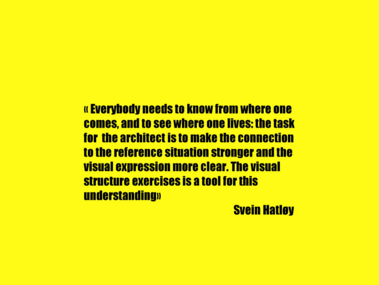 «Everybody needs to know from where one comes, and to see where one lives: the task for the architect is to make the connection to the reference situation stronger and the visual expression more clear. The visual structure exercises is a tool for this understanding» Svein Hatløy