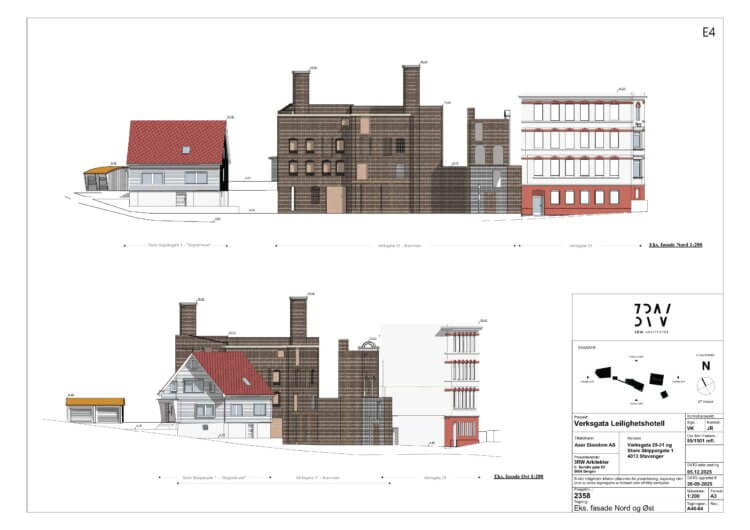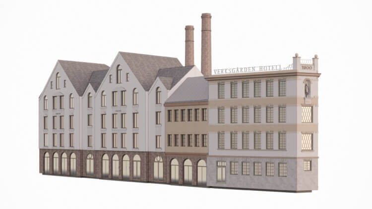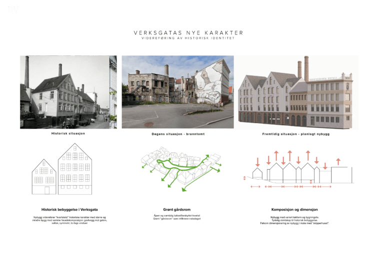 Det eksisterende Skipperhuset i Store Skippergate 1 flyttes internt på tomten iht. plankart og tilbakeføres til sin historiske «drakt/fasade» og vil få nytt program. Det eksisterende murbygget i Verksgata 29 skal delvis tilbakeføres til opprinnelig fasade og skal utvikles som leilighetshotell, samt tilpasses nybygg/leilighetshotell som er planlagt i Verksgata 31. Nybygget i Verksgata 31 skal bestå av leilighetshotell over fire plan, med publikumsrettet virksomhet på gateplan. To industripiper skal gjenreises til opprinnelig høyde i «bakgårdsparken» på sørsiden av eksisterende og ny bebyggelse. Nybygg og eksisterende bygg skal danne en helhet for Verksgata, hvor hvert bygg fremstår individuelt, samtidig som det oppleves som en del av en større helhet.