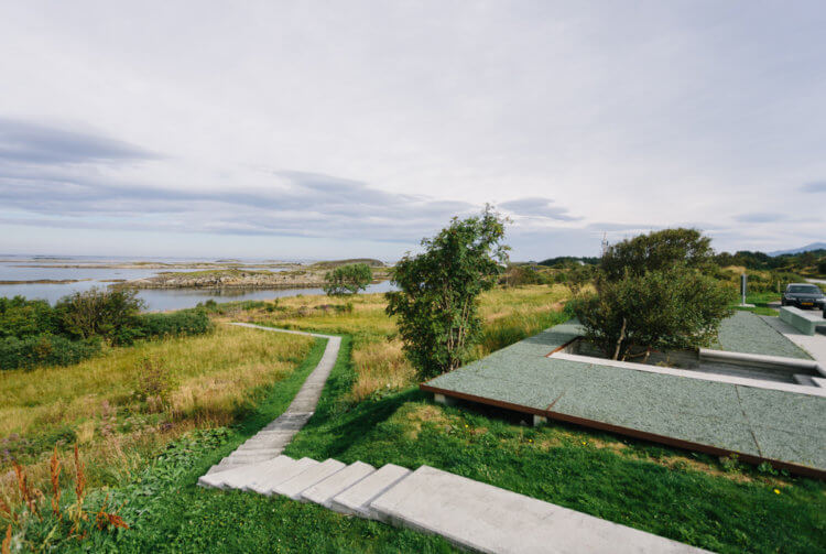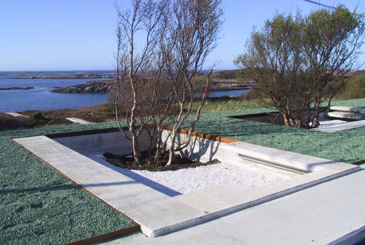 The resting area is constructed around two old trees. They are preserved as central elements showing clear signs of exposure to the rough coastal climate. Each of them is framed by a recessed rectangular garden of gravel and benches. The green gravel topping is a waste product from the local melting industry and kept in place by a steel framework.