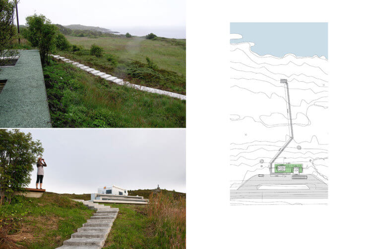 A narrow path of bright concrete leads from the viewpoint to the ocean. The path follows small variations in the landscape, creating a contrast to the viewpoint itself and protect the vulnerable wetland landscape from adventurous footsteps. The project is an insertion of cultivated nature that displays and protects the original landscape.