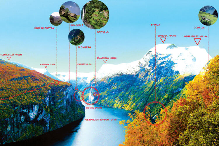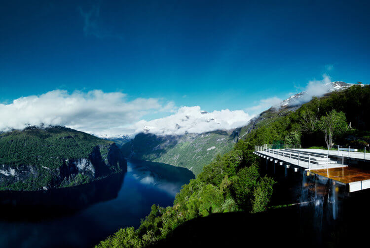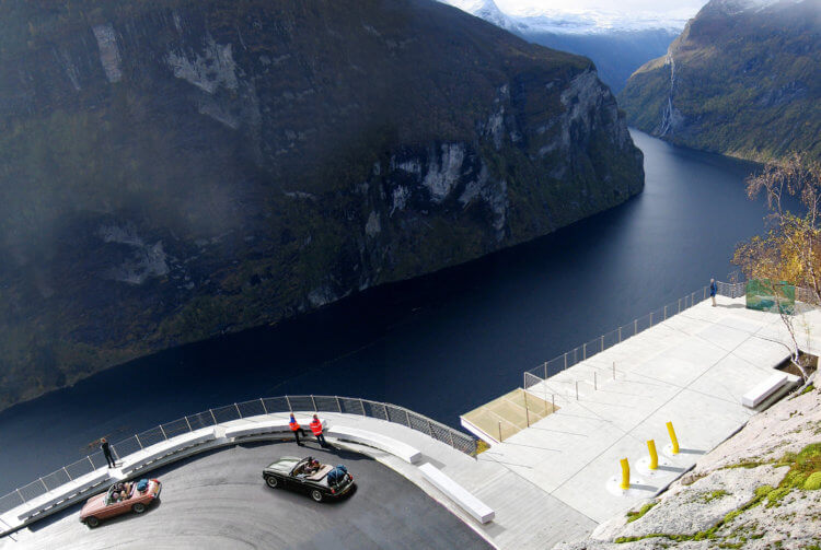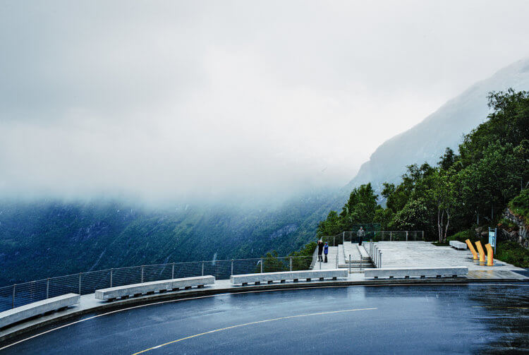 The town has only 250 permanent residents and goes each year through an extreme transformation due to over 700 000 tourists who visit the fjord during the 4 months of summer. During winter Geiranger is often isolated without road connection due to danger of avalanche. The fjord itself than becomes the only connection to the outside world. The project consists of three overlapping white concrete slabs overhanging the edge of a 455-metre vertical drop, enabling the observer to step out into the airspace. The horizontal slabs make an amfi to the view and reflects the calm fjord in contrast to the dramatic mountains.