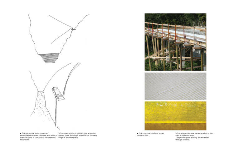 3RW worked with the artist May Elin Eikaas Bjerck on how to treat the concrete slabs in different ways so it reflects the light and communicates with the nearby nature. The river on site is guided over a glazed front. Forming a cultivated waterfall on the very edge of the viewpoint it gives an atmospheric sound to the place. Information board in glass explain specific locations in the scenery with interesting traces of civilization as old farms placed in incredible places on the steep mountainsides. This story of culture and nature tells about the cultivated landscape which at first sight seems untouched by man.
