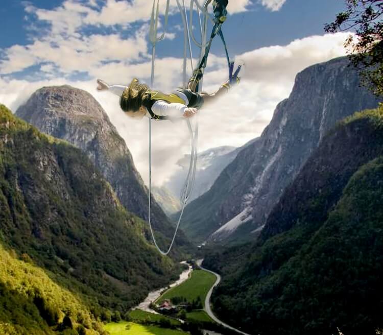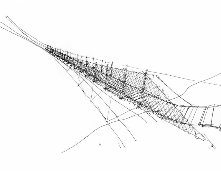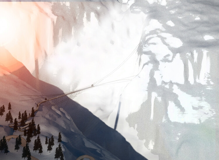 In all cultures with mountains and fjords hanging bridges are the most common way to cross large canyons with stretched wires that carry the walkway. This is also the most effective solution in terms of the use of material and the economies of construction, an airiness and lightness proposal that gives a unique experience of nature. A suspended bridge causes minimal impact on the landscape where it is attached to the ground through anchors drilled into the rocks. One needs neither concrete nor dynamite for mounting a suspension bridge and it can be removed without visible traces.