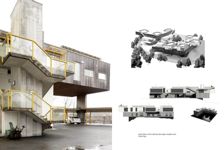 The building scheme enables both high utilization of the site, and a small scale appearance. The concept is based on the idea to obtain a maximum amount of high quality outdoor areas, and at the same time organize the buildings so that they protect these areas from the present traffic noise and the wind and the rain.